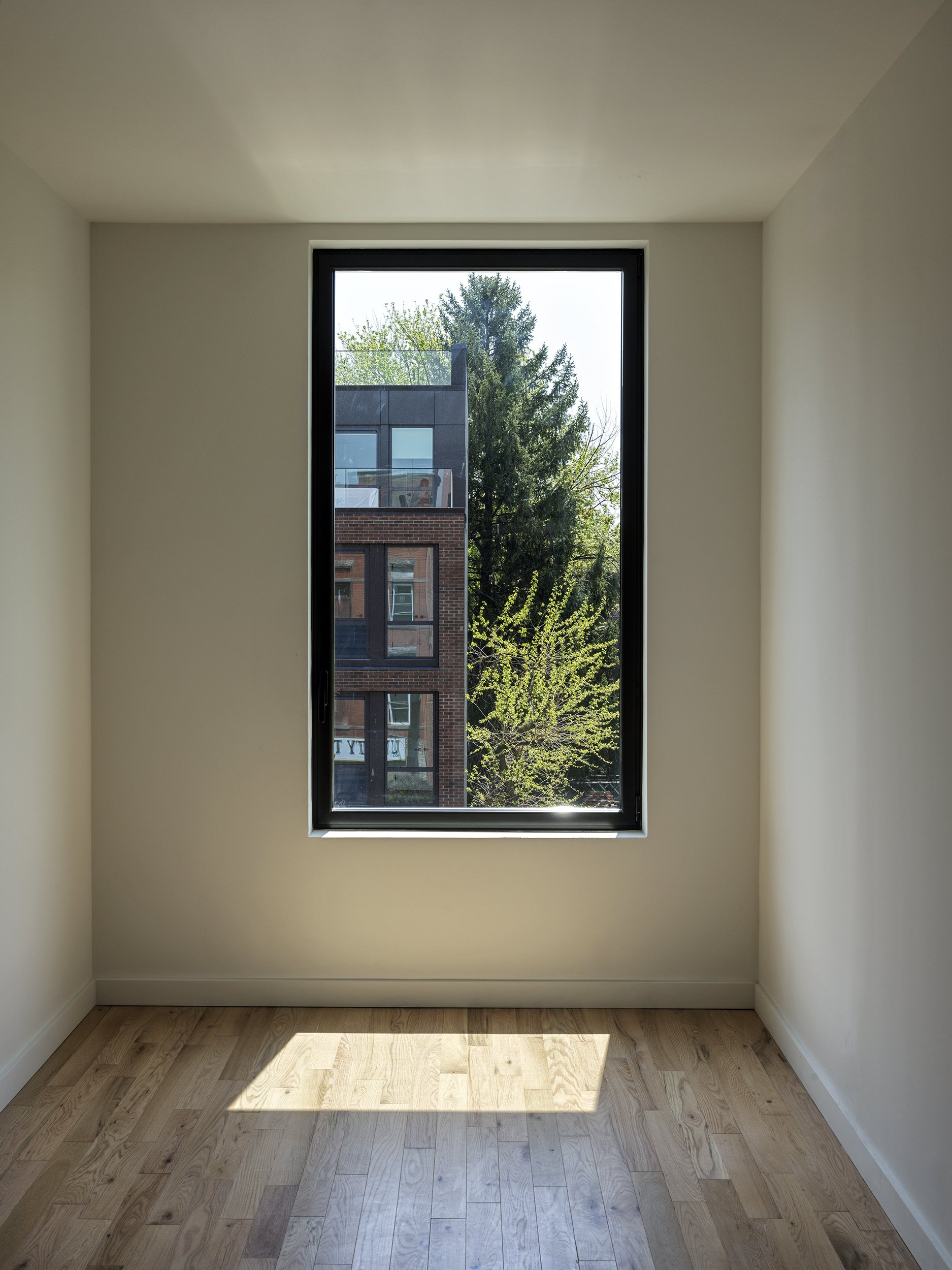 The brick church’s proximity led to a design that uses but does not replicate traditional brick construction. Rather, the brick chip facade texture blends the contemporary and traditional with sustainable practices in a reinterpretation of the neighborhood’s architecture.