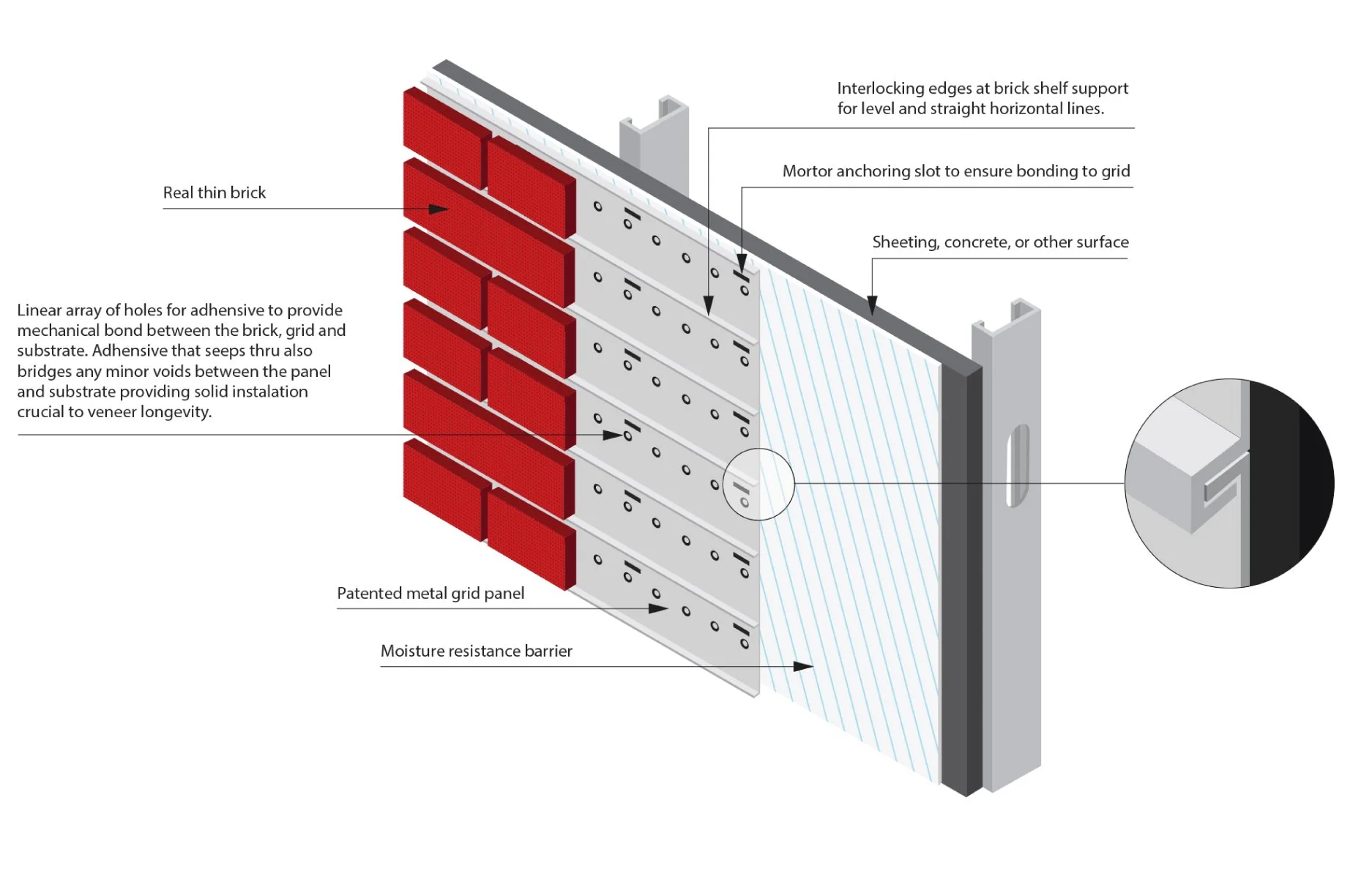 After seeing the initial idea, the client proposed using a brick tile system they were considering for a large multi family development. It consists of brick tiles interlocked into metal grid panels installed on the building wall. By using the bricks as pixels, the layered earth wall pattern was developed.